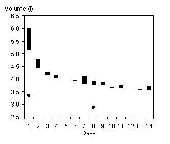 The bars in the graph above show the decrease in the volume of the afflicted arm of a person with one-sided secondary lymphoedema before and after MLD treatment over a period of 14 days. Two volume measurements of the healthy arm are also shown (round points). The reduction in volume over 14 days from the afflicted arm equates to an overall loss of 2.4 litres of fluid. There is always a small loss - in this case ~0.5 litres - of fluid from the unaffected arm. Data from Tribe, K. (1995) Physiotherapy 81 (3): 154-156. Your case history will be required from your GP before you come for treatment. Call 07746 964151 or email us for more information.